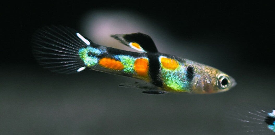 De Guppy El Tigre Endler man is een echte blikvanger in elk aquarium. Met zijn felgekleurde, tijgerachtige strepen in zwart, oranje en groenblauw steelt hij de show in elke nano- of gezelschapsbak.