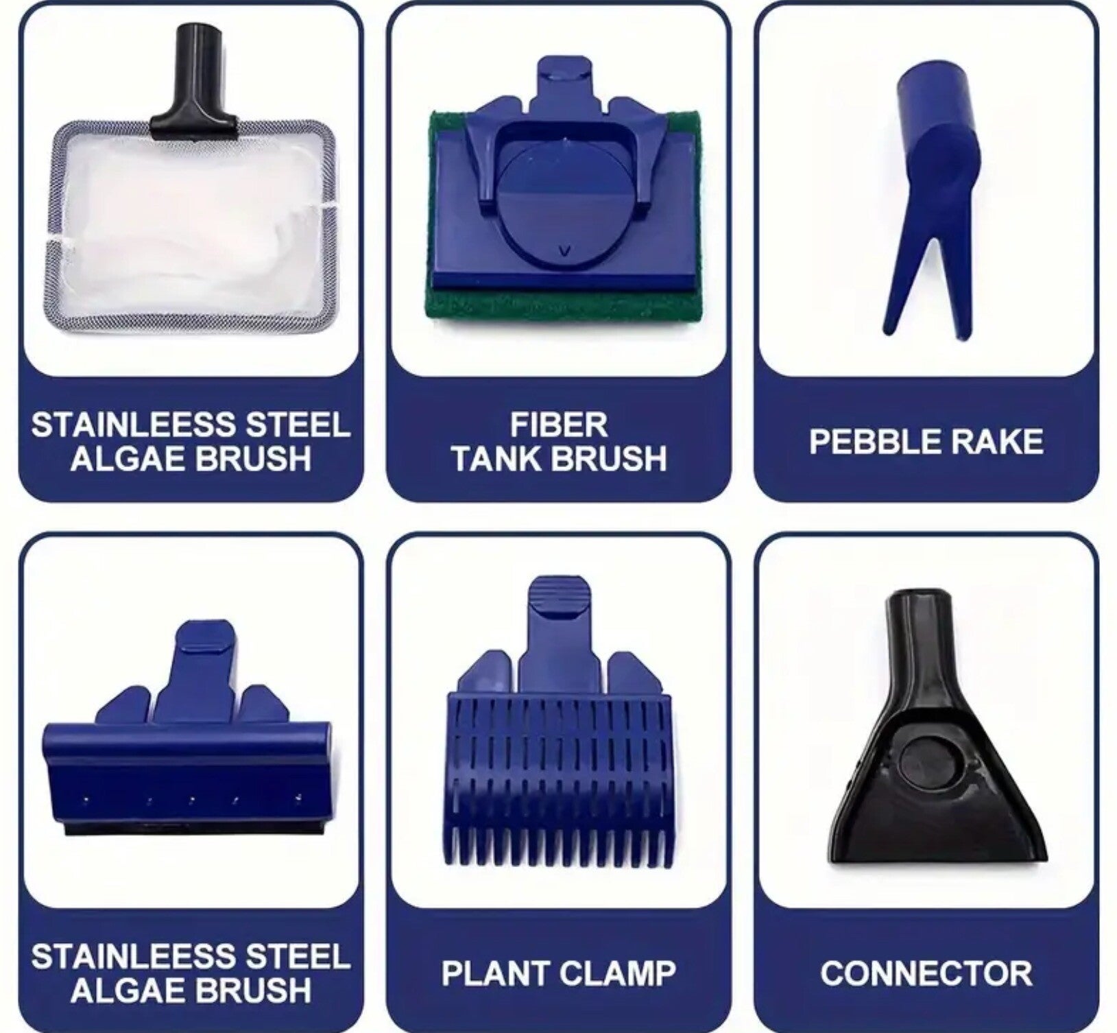 Complete set met alles wat je nodig hebt voor het onderhoud van je aquarium: netje, spons, plantenschaar, algenkrabber en scape-harkje. Dankzij de lange steel van 49 cm werk je comfortabel, ook in grotere aquaria.