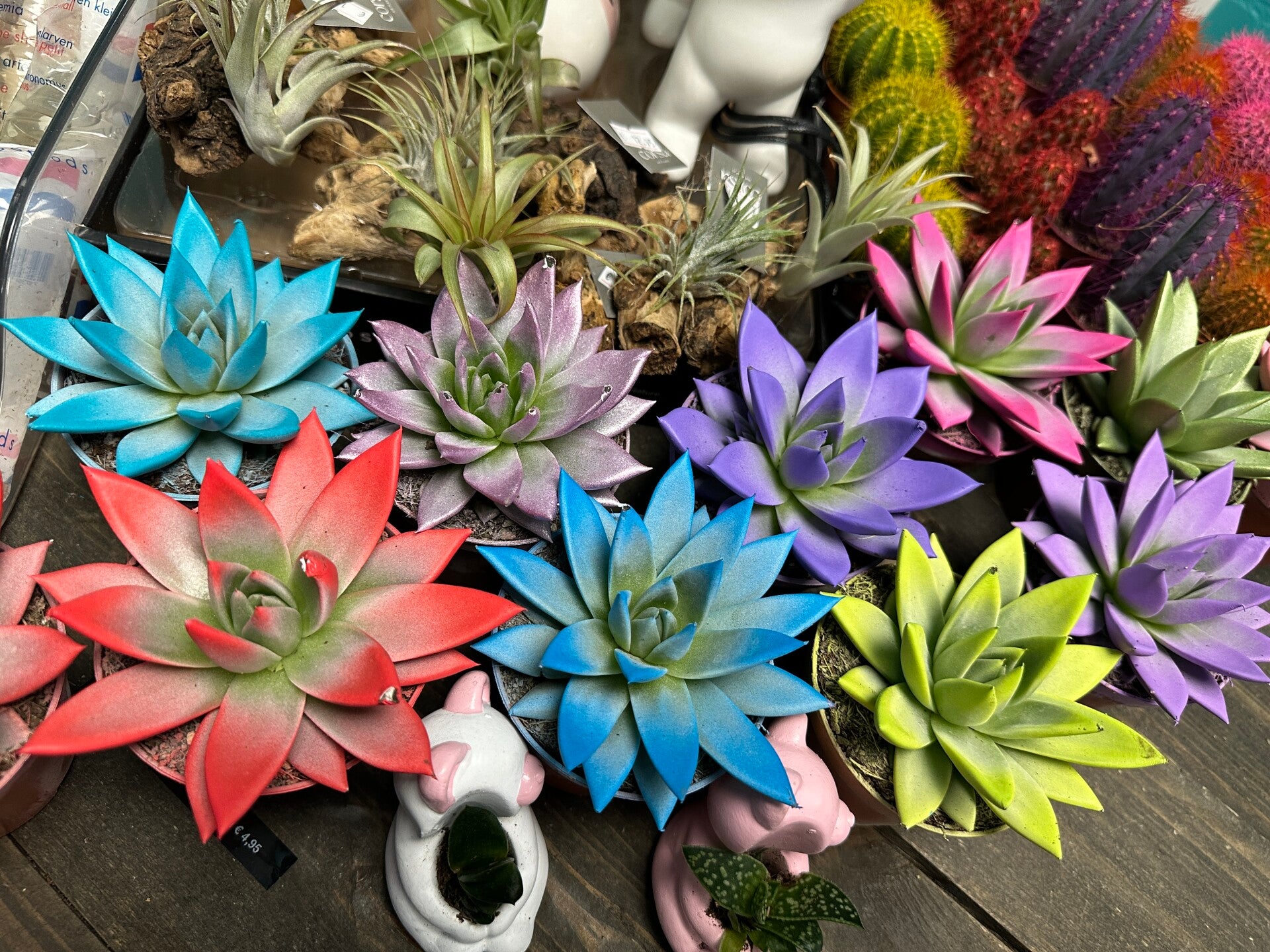 Op zoek naar iets opvallends? Deze kunstmatig gekleurde Echeveria’s springen direct in het oog met hun felle, unieke kleuren. Van roze en blauw tot paars en multicolor – perfect voor wie eens iets anders wil dan de natuurlijke groentinten.
