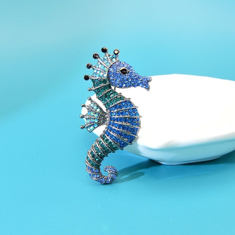 Voeg een vleugje maritieme elegantie toe aan je outfit met deze vintage zeepaardje broche, verkrijgbaar in rood, blauw en koffiekleur. Gemaakt van hoogwaardige zinklegering en schitterende rijnstenen, voor een subtiele maar opvallende look.