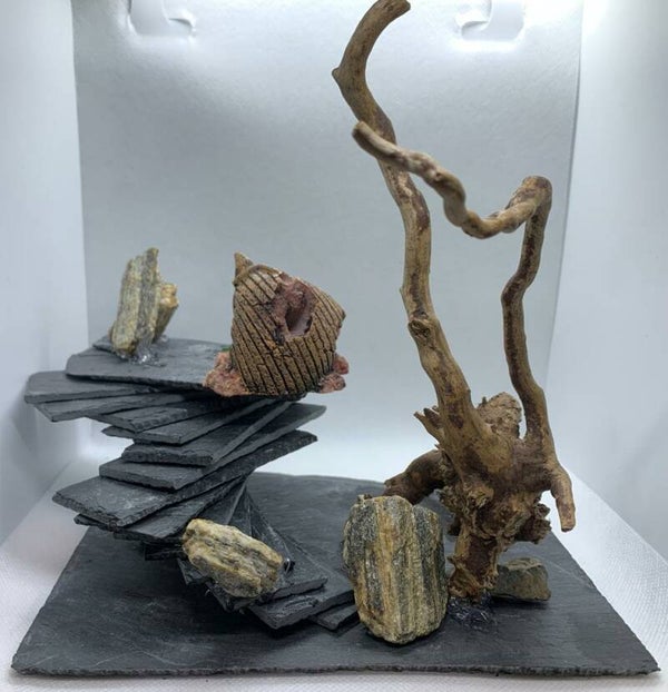 Materialen: Leisteen, wortelhout, aquariumsteentjes, Farao ornament